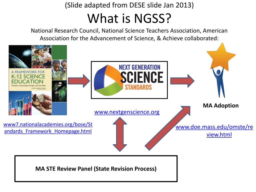 (Slide adapted from DESE slide Jan 2013)What is NGSS?National Research Council, National Science Teachers Association, American Association for the Advancement of Science, & Achieve collaborated: MA Adoption www.nextgenscience.org www7.nationalacademies.org/bose/Standards_Framework_Homepage.html www.doe.mass.edu/omste/review.html MA STE Review Panel (State Revision Process)