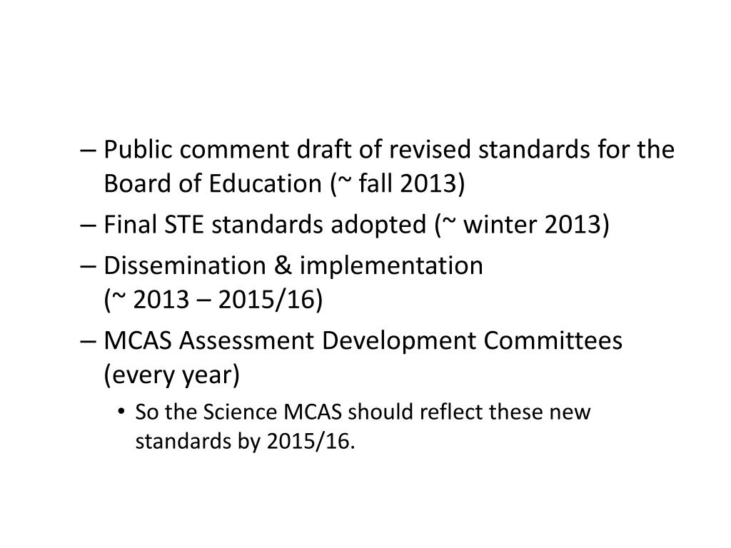 Public comment draft of revised standards for the Board of Education (~ fall 2013) • Final STE standards adopted (~ winter 2013) • Dissemination & implementation (~ 2013 – 2015/16) • MCAS Assessment Development Committees (every year) • So the Science MCAS should reflect these new standards by 2015/16.