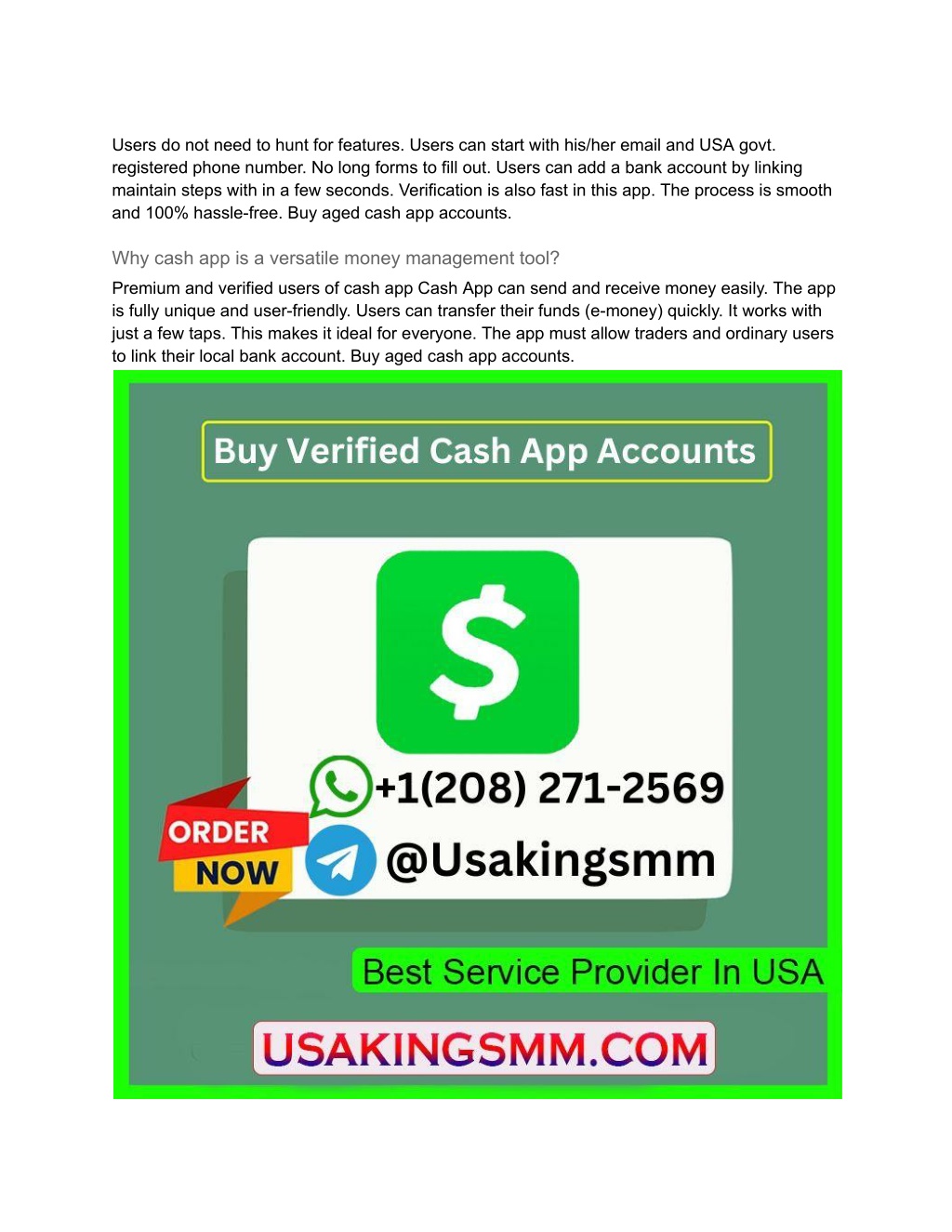 2. Why peoples buy cash app accounts? There are many constructive reasons to buy cash app accounts, let’s explain a few of them. First of all cash app is a mobile banking system which permits its users for instant money deposit, send, receive and unlock opportunities in Binary and crypto trading. Cash app is the magnificent cash flow management wallet to manage digital asset to invent in the global giant platforms. The other reason is the constructive and user-friendly interfaces for conserving digital asset. Buy aged cash app accounts. So, if you want to buy cash app accounts from the moat trusted source, (Usakingsmm) could be your first choice. When you take decision for trading you should have to manage your cash flow with a secured source. You need then a secured wallet like cash app or PayPal. And as cash app is mobile banking system, you can manage cash for deposit instantly, or withdraw money from your local bank to your wallet. Buy Verified Cash App Accounts at (Usakingsmm). ➥ 24 Hours Reply/Contact ➤ Telegram: @Usakingsmm ➤ WhatsApp: +1(208) 271-2569 ➤ Email: usakingsmm@gmail.com Website Visit Now:-Click the link:- https://usakingsmm.com/product/buy-verified-cash-app-accounts/ Why cash app is called as the most important and easy to use e-banking? Cash App is called the easiest tool to use Mobile Banking System due to its advanced interface and versatile financial services. It efficiently manages e-money through accelerated transactions and instant fund transfers. Cash App has raise as a mobile banking with its expertizing platform. Users can transact money instantly, making it ideal for personal and business transactions. Buy aged cash app accounts at (Usakingsmm). The app offers particular advanced features like direct deposits, BTC trading, and even a customizable debit card. Its secure system ensures the safety of users’ financial data. With real-time notifications, users can monetize every transaction, enhancing financial data with transparency. Cash App’s integration with major local and international banks and financial institutions. This versatility and reliability make it the popular even sometimes first choice for mobile banking. Buy aged cash app accounts. How cash app make user experience better? Cash App offers distinct offers for advanced interface. Users can easily attach and use through the app. Peoples take buttons and clear labels help users find what they need. The design is clean and simple. Even intelligence kids can understand how to use cash app easily without hassle. The app shows important information first. Buy aged cash app accounts for real time trading and instant withdrawal.