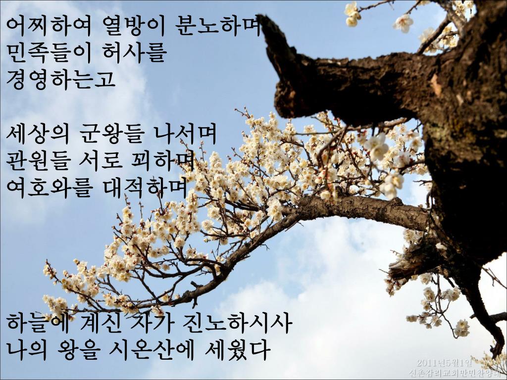 어찌하여 열방이 분노하며 민족들이 허사를 경영하는고 세상의 군왕들 나서며 관원들 서로 꾀하며 여호와를 대적하며 하늘에 계신 자가 진노하시사 나의 왕을 시온산에 세웠다 2011년5월1일 신촌감리교회만민찬양대