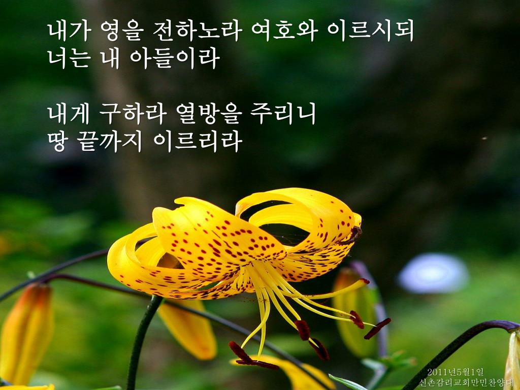 내가 영을 전하노라 여호와 이르시되 너는 내 아들이라 내게 구하라 열방을 주리니 땅 끝까지 이르리라 2011년5월1일 신촌감리교회만민찬양대