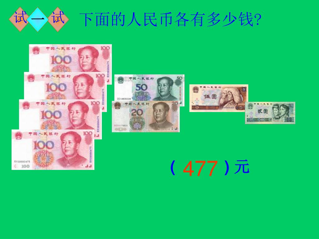试 试 一 下面的人民币各有多少钱? 477 ( ) 元