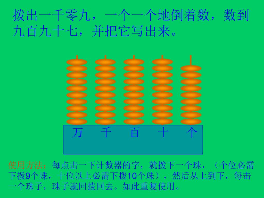 拨出一千零九,一个一个地倒着数,数到 九百九十七,并把它写出来。 十 百 千 个 万 使用方法:每点击一下计数器的字,就拨下一个珠,(个位必需 下拨9个珠,十位以上必需下拨10个珠),然后从上到下,每击 一个珠子,珠子就回拨回去。如此重复使用。
