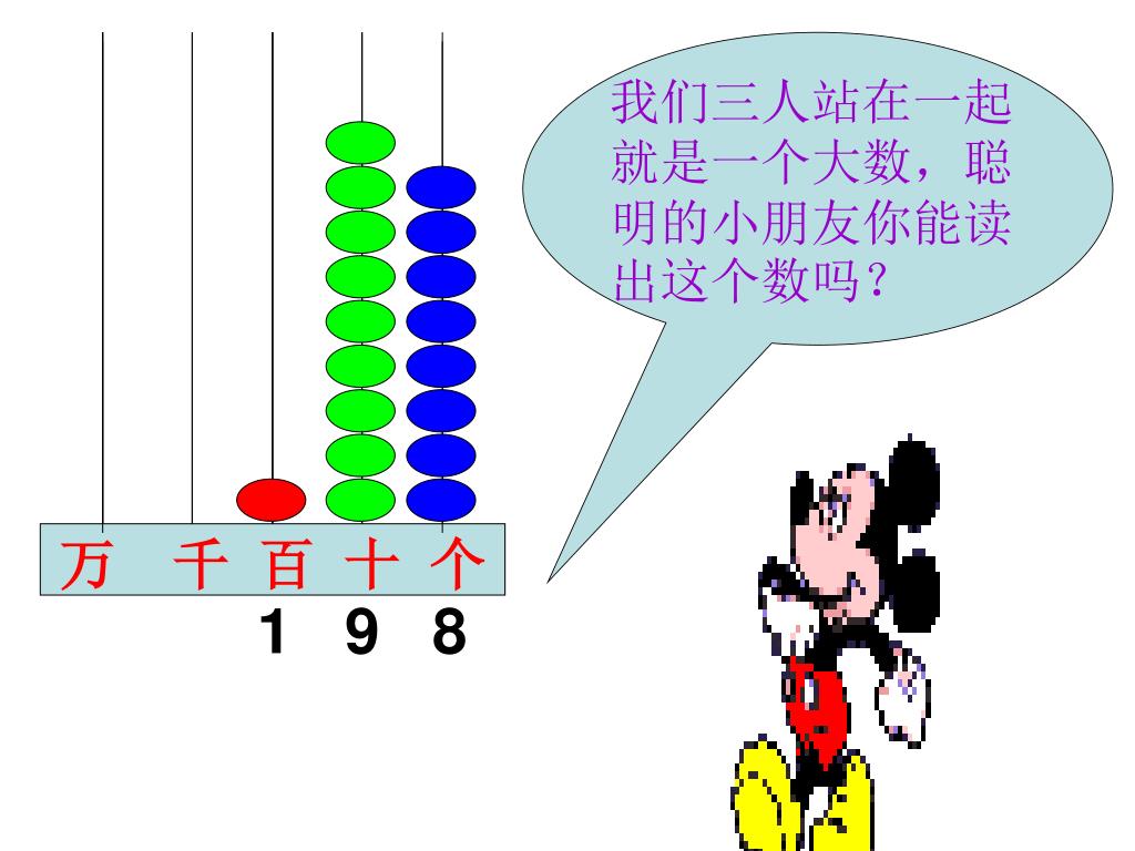 万 千 百 十 个 我们三人站在一起就是一个大数,聪明的小朋友你能读出这个数吗? 1 9 8