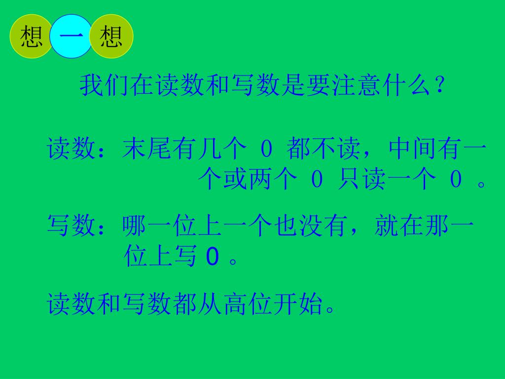 想 一 想 我们在读数和写数是要注意什么? 读数:末尾有几个 0 都不读,中间有一 个或两个 0 只读一个 0 。 写数:哪一位上一个也没有,就在那一 位上写 0 。 读数和写数都从高位开始。
