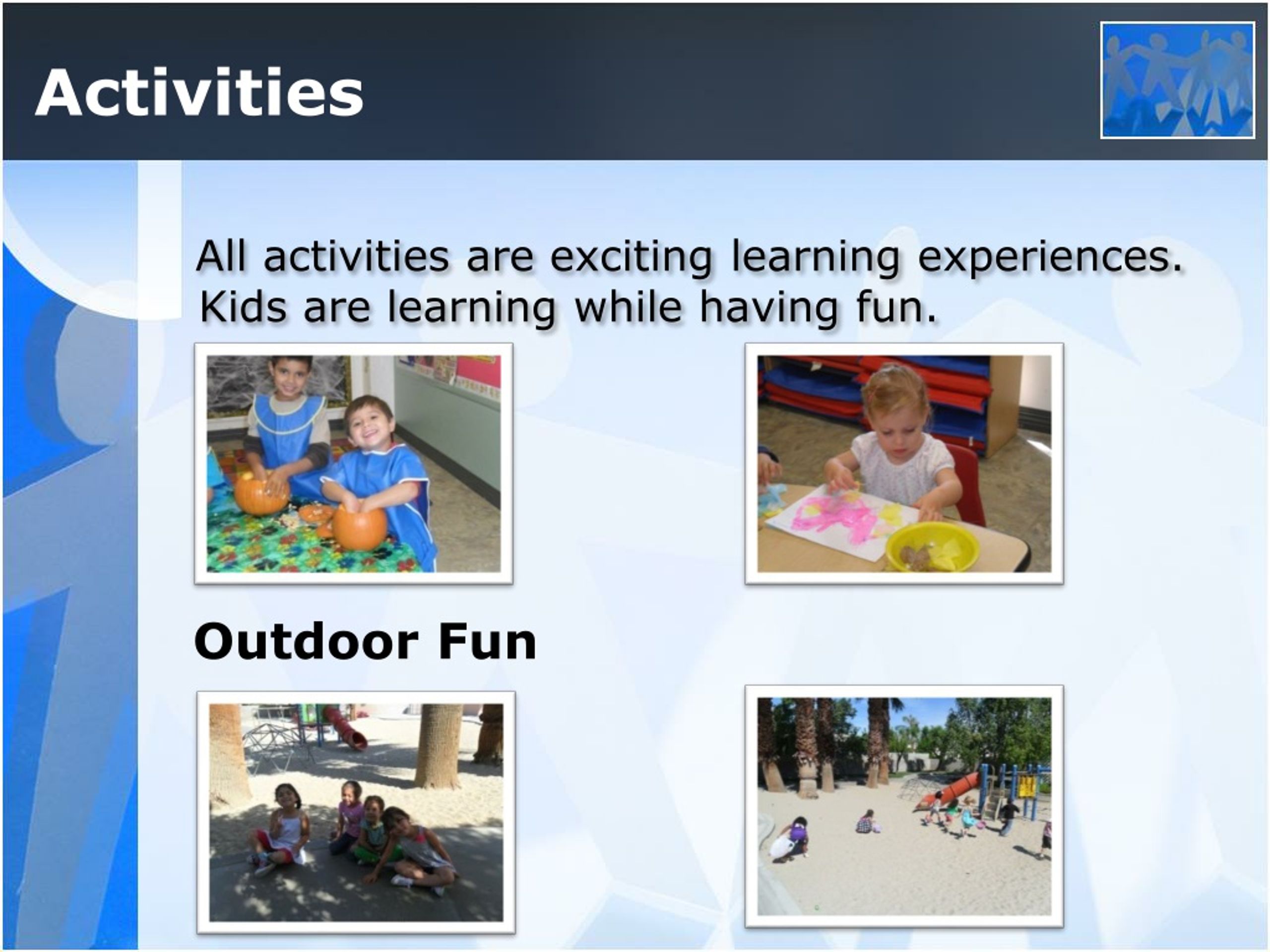 Activities All activities are exciting learning experiences. Kids are learning while having fun. Outdoor Fun