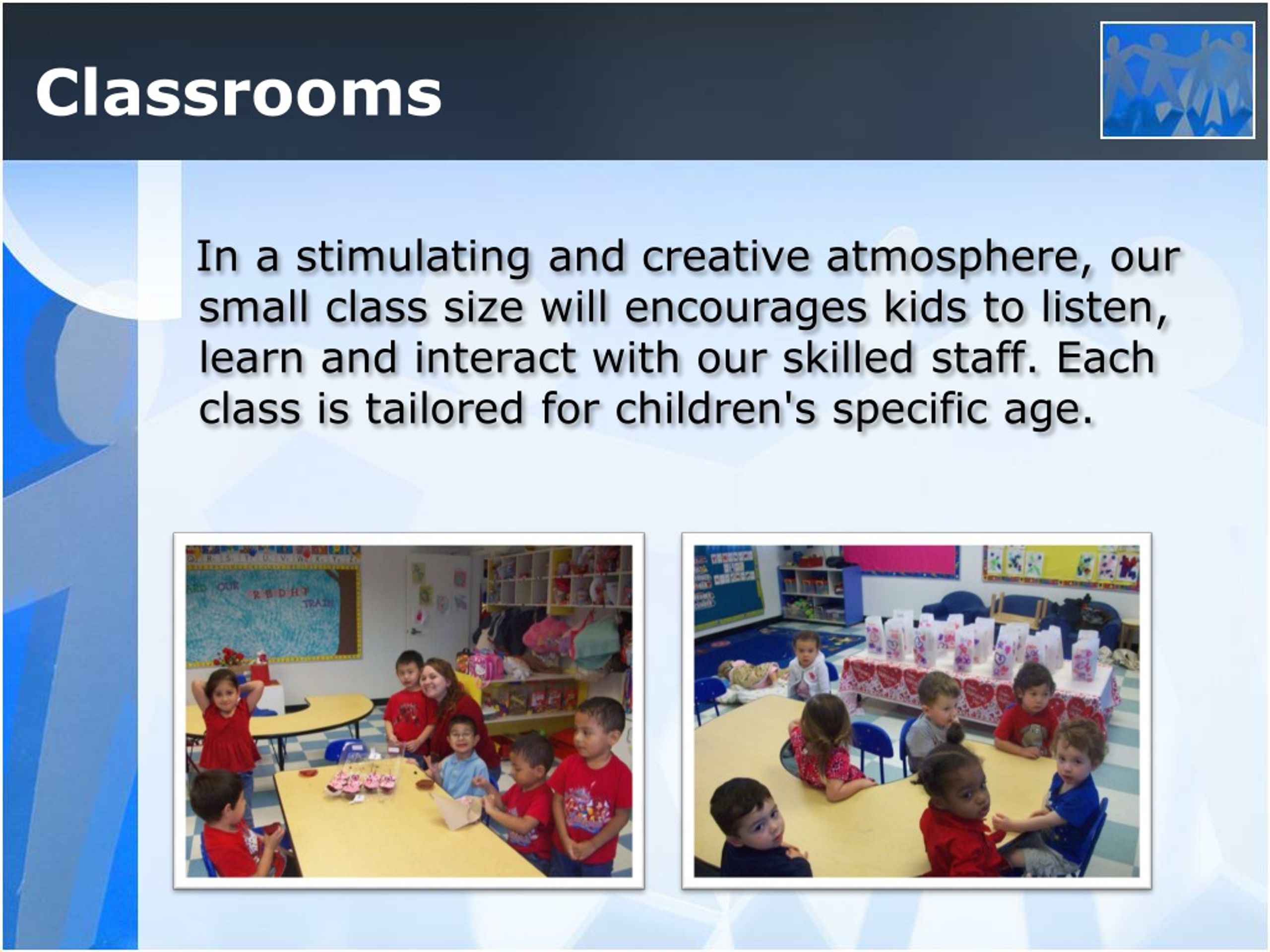 Classrooms In a stimulating and creative atmosphere, our small class size will encourages kids to listen, learn and interact with our skilled staff. Each class is tailored for children's specific age.