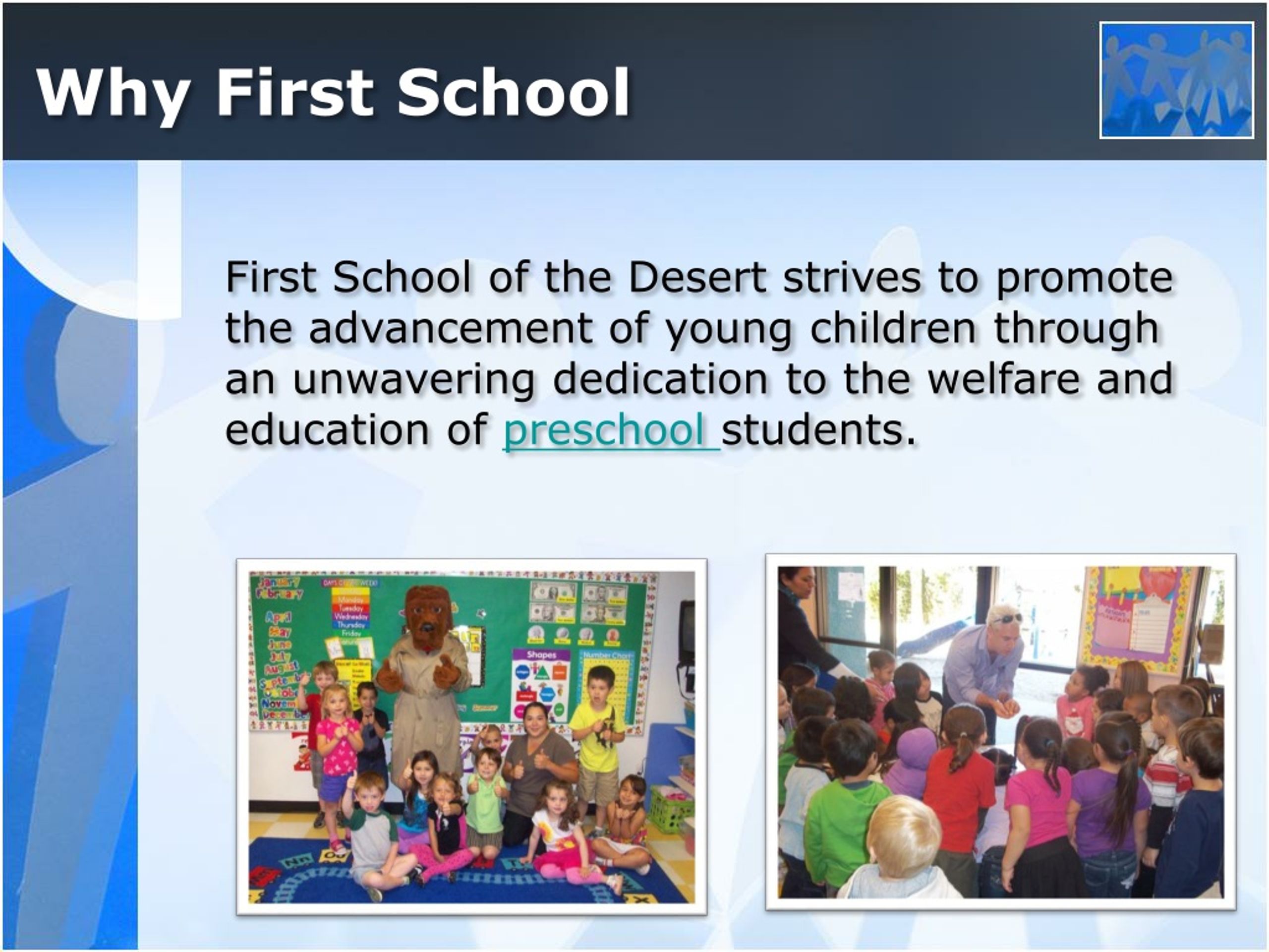 Why First School First School of the Desert strives to promote the advancement of young children through an unwavering dedication to the welfare and education of preschool students.