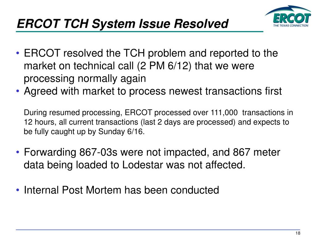 ERCOT TCH System Issue Resolved • ERCOT resolved the TCH problem and reported to the market on technical call (2 PM 6/12) that we were processing normally again • Agreed with market to process newest transactions first During resumed processing, ERCOT processed over 111,000 transactions in 12 hours, all current transactions (last 2 days are processed) and expects to be fully caught up by Sunday 6/16. • Forwarding 867-03s were not impacted, and 867 meter data being loaded to Lodestar was not affected. • Internal Post Mortem has been conducted