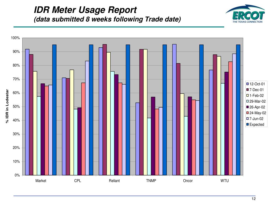 IDR Meter Usage Report (as of 6/13/02)Percent of IDR accounts received by ERCOT since August 95% or better expected 66% * NOTE: ERCOT (and REPs) may have received additional non-sequential data (i.e, February data before January data). ERCOT rejects all meter reads that introduce gaps in the database