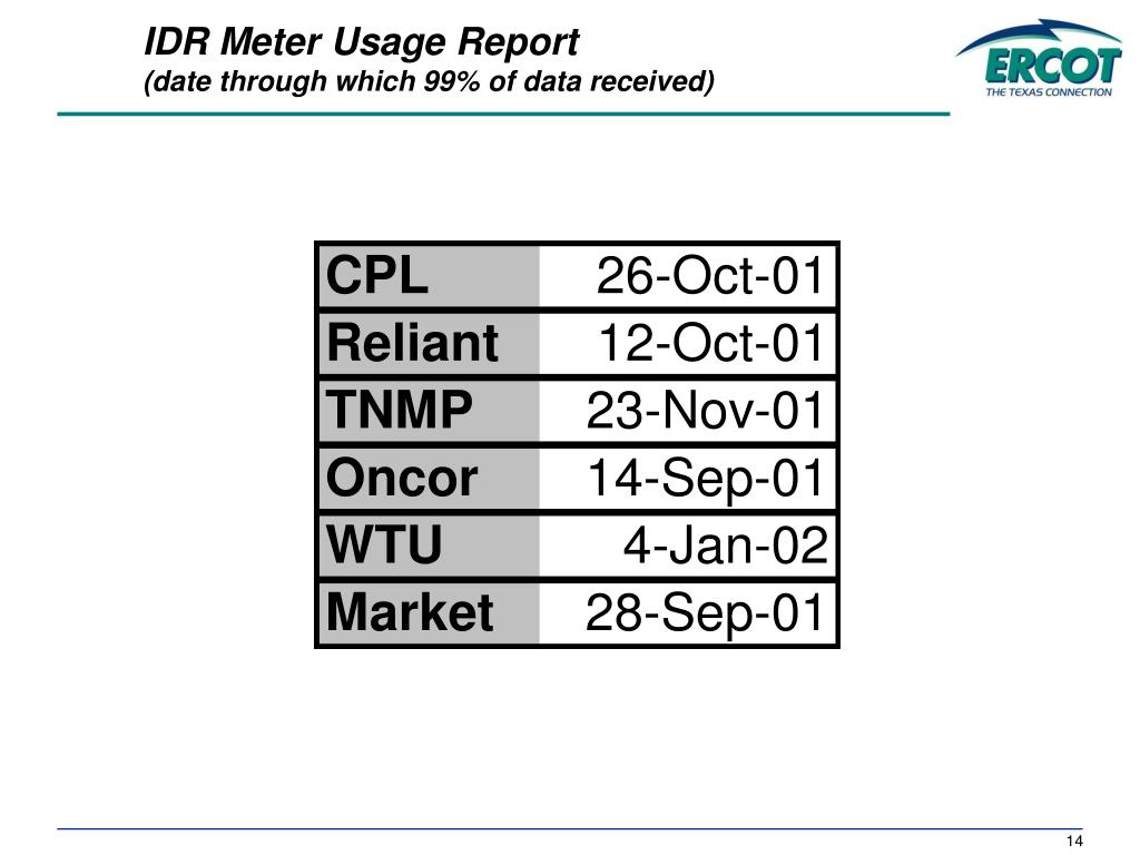 Updates for RMS on June 14, 2002 • Update on PTB Synchronization Plan • Status on synchronizing the CR of record • Provide Update from Previous RMS issues • Portal Performance and Changes • IDR / Non IDR Meter Usage Reports • Status of ERCOT TCH Performance Issue • Update on Enhanced MP EDI Reporting Effort