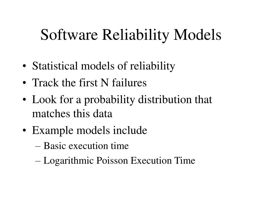 Developing models • Track failures and execution time • Time to failure • Time between failure • Fit to statistical distribution • Estimate distribution parameters • Estimate reliability for some future time