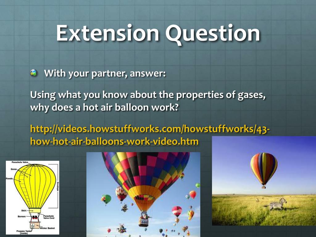 Extension Question • With your partner, answer: Using what you know about the properties of gases, why does a hot air balloon work? http://videos.howstuffworks.com/howstuffworks/43-how-hot-air-balloons-work-video.htm