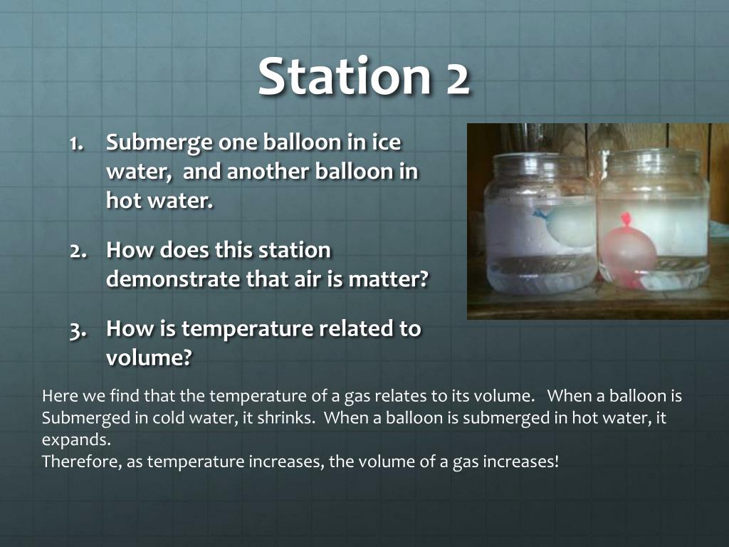 Station 2 • Submerge one balloon in ice water, and another balloon in hot water. • How does this station demonstrate that air is matter? • How is temperature related to volume? Here we find that the temperature of a gas relates to its volume. When a balloon is Submerged in cold water, it shrinks. When a balloon is submerged in hot water, it expands. Therefore, as temperature increases, the volume of a gas increases!