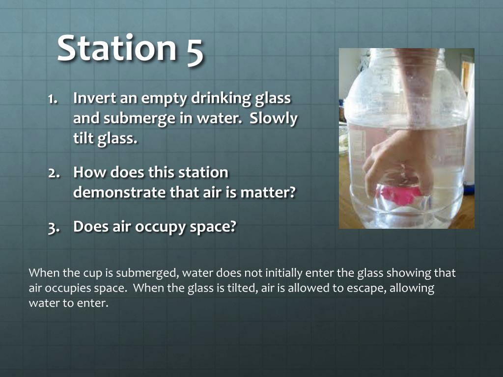 Station 5 • Invert an empty drinking glass and submerge in water. Slowly tilt glass. • How does this station demonstrate that air is matter? • Does air occupy space? When the cup is submerged, water does not initially enter the glass showing that air occupies space. When the glass is tilted, air is allowed to escape, allowing water to enter.