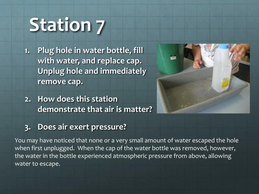 Station 7 • Plug hole in water bottle, fill with water, and replace cap. Unplug hole and immediately remove cap. • How does this station demonstrate that air is matter? • Does air exert pressure? You may have noticed that none or a very small amount of water escaped the hole when first unplugged. When the cap of the water bottle was removed, however, the water in the bottle experienced atmospheric pressure from above, allowing water to escape.