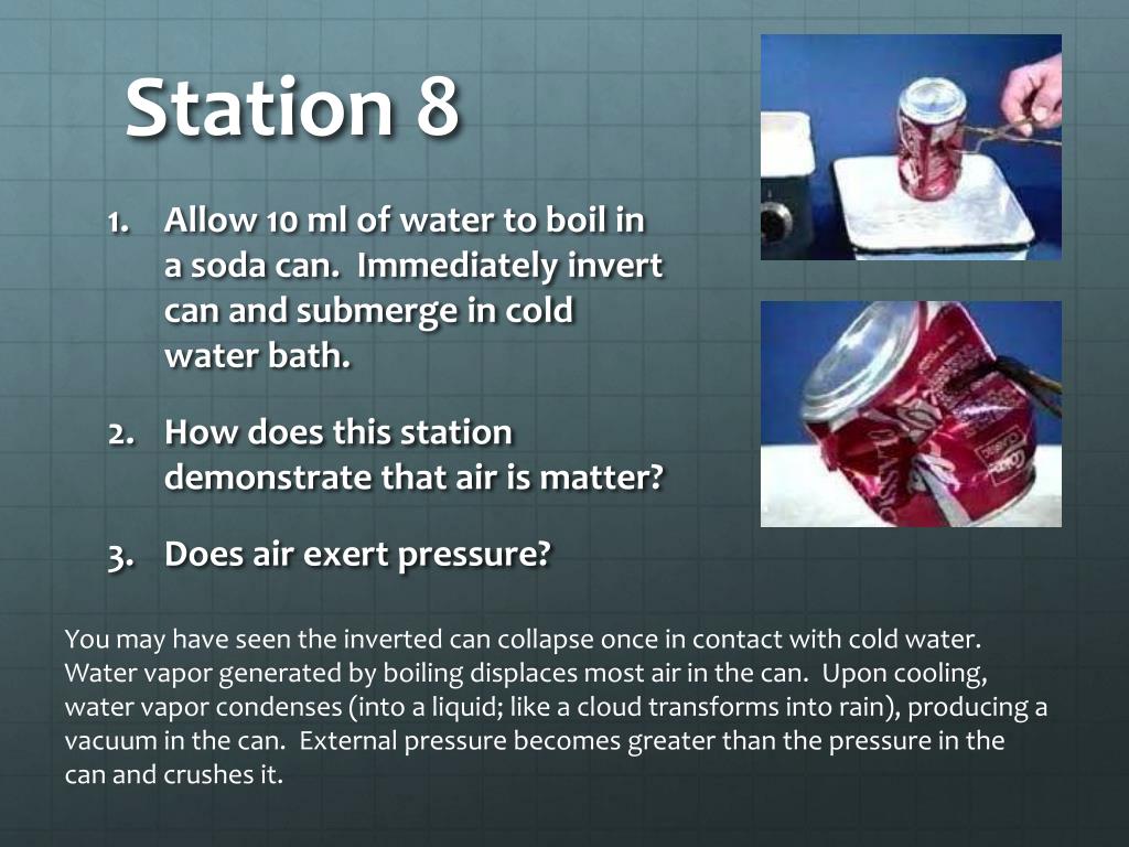 Station 8 • Allow 10 ml of water to boil in a soda can. Immediately invert can and submerge in cold water bath. • How does this station demonstrate that air is matter? • Does air exert pressure? You may have seen the inverted can collapse once in contact with cold water. Water vapor generated by boiling displaces most air in the can. Upon cooling, water vapor condenses (into a liquid;like a cloud transforms into rain), producing a vacuum in the can. External pressure becomes greater than the pressure in the can and crushes it.