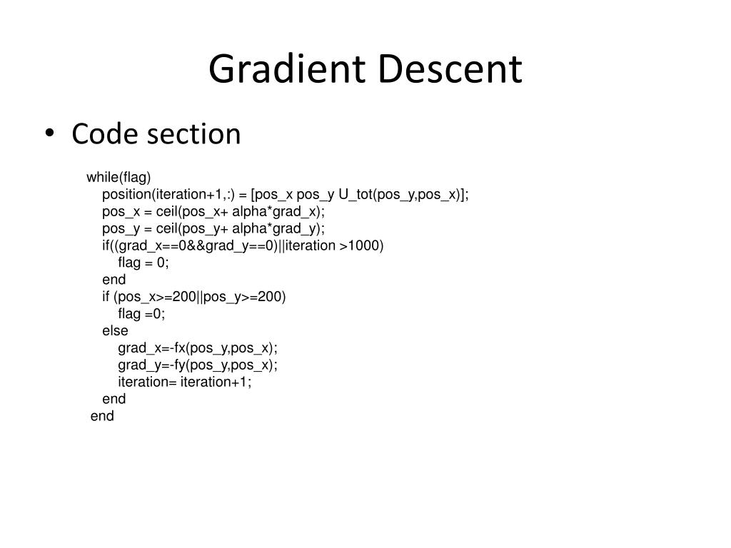 Gradient Descent • Code section while(flag) position(iteration+1,:) = [pos_xpos_yU_tot(pos_y,pos_x)]; pos_x = ceil(pos_x+ alpha*grad_x); pos_y = ceil(pos_y+ alpha*grad_y); if((grad_x==0&&grad_y==0)||iteration >1000) flag = 0; end if (pos_x>=200||pos_y>=200) flag =0; else grad_x=-fx(pos_y,pos_x); grad_y=-fy(pos_y,pos_x); iteration= iteration+1; end end