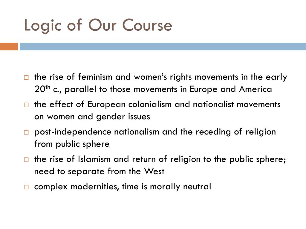 Islam, gender, and modernity. Instructor: Claire R obison Summer 2014. Logic of Our Course. the rise of feminism and women’s rights movements in the early 20 th c., parallel to those movements in Europe and America