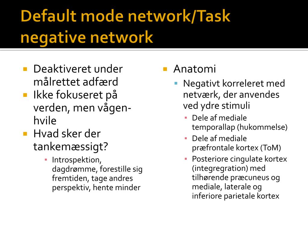 Default mode network/Task negative network • Deaktiveret under målrettet adfærd • Ikke fokuseret på verden, men vågen-hvile • Hvad sker der tankemæssigt? • Introspektion, dagdrømme, forestille sig fremtiden, tage andres perspektiv, hente minder • Anatomi • Negativt korreleret med netværk, der anvendes ved ydre stimuli • Dele af mediale temporallap (hukommelse) • Dele af mediale præfrontale kortex (ToM) • Posteriorecingulatekortex (integregration) med tilhørende præcuneus og mediale, laterale og inferioreparietalekortex