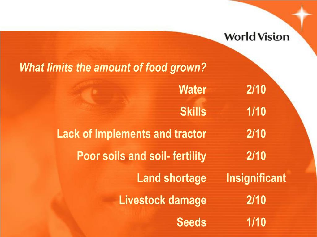 What limits the amount of food grown? Water 2/10 Skills 1/10 Lack of implements and tractor 2/10 Poor soils and soil- fertility 2/10 Land shortage Insignificant Livestock damage 2/10 Seeds 1/10