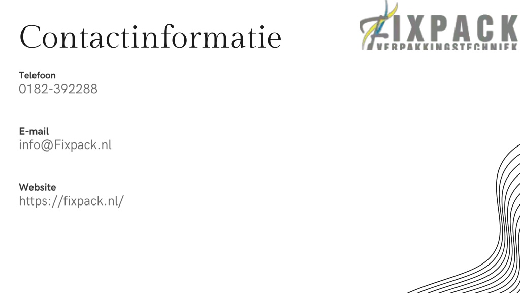 Telefoon • 0182-392288 • Contactinformatie • E-mail • info@Fixpack.nl • Website • https://fixpack.nl/