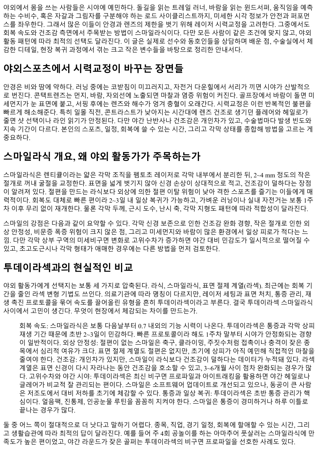 야외에서몸을쓰는사람들은시야에예민하다. 돌길을읽는트레일러너, 바람을읽는윈드서퍼, 움직임을예측 하는수비수, 혹은자갈과그림자를구분해야하는로드사이클리스트까지, 미세한시각정보가안전과퍼포먼 스를좌우한다. 그래서많은이들이안경과렌즈의제한을벗기위해레이저시력교정을고려한다. 그중에서도 회복속도와건조감측면에서주목받는방법이스마일라식이다. 다만모든사람이같은조건에맞지않고, 야외 활동패턴에따라최적의선택도달라진다. 이글은실제로선수와동호인들을상담하며배운점, 수술실에서체 감한디테일, 현장복귀과정에서겪는크고작은변수들을바탕으로정리한안내서다. 야외스포츠에서시력교정이바꾸는장면들 안경은비와땀에약하다. 러닝중에는코받침이미끄러지고, 자전거다운힐에서서리가끼면시야가산발적으 로번진다. 콘택트렌즈는먼지, 바람, 자외선에노출되면마찰과염증위험이커진다. 골프장에서바람이돌면미 세먼지가눈표면에붙고, 서핑후에는렌즈와해수가엉겨충혈이오래간다. 시력교정은이런반복적인불편을 빠르게해소해준다. 특히일몰직전, 콘트라스트가낮아지는시간대에렌즈건조로생기던플레어와헤일로가 줄면샷선택이나라인읽기가안정된다. 다만야간난반사나건조감은개인차가있고, 수술법마다발생빈도와 지속기간이다르다. 본인의스포츠, 일정, 회복에쓸수있는시간, 그리고각막상태를종합해방법을고르는게 중요하다. 스마일라식개요, 왜야외활동가가주목하는가 스마일라식은렌티큘이라는얇은각막조직을펨토초레이저로각막내부에서분리한뒤, 2~4 mm 정도의작은 절개로꺼내굴절을교정한다. 표면을넓게벗기지않아신경손상이상대적으로적고, 건조감이덜하다는장점 이알려져있다. 절편을만드는라식보다외상에의한절편이탈위험이낮아격한스포츠를즐기는이들에게매 력적이다. 회복도대체로빠른편이라 2~3일내일상복귀가가능하고, 가벼운러닝이나실내자전거는보통 1주 차이후무리없이재개한다. 물론각막두께, 근시도수, 난시축, 각막지형도패턴에따라적합성이달라진다. 스마일의강점은다음과같이요약할수있다. 각막신경보존으로인한건조감완화경향, 작은절개로인한외 상안정성, 비문증폭증위험이크지않은점, 그리고미세먼지와바람이많은환경에서일상피로가적다는느 낌. 다만각막상부구역의미세비구면변화로고위수차가증가하면야간대비민감도가일시적으로떨어질수 있고, 초고도근시나각막형태가애매한경우에는다른방법을먼저검토한다. 투데이라섹과의현실적인비교 야외활동가에게선택지는보통세가지로압축된다. 라식, 스마일라식, 표면절제계열(라섹). 최근에는회복기 간을줄인라섹변형기법도쓰인다. 의료기관에따라명칭이다르지만, 레이저세팅과표면처치, 통증관리, 재 생촉진프로토콜을묶어속도를끌어올린유형을흔히투데이라섹이라고부른다. 결국투데이라섹스마일라식 사이에서고민이생긴다. 무엇이현장에서체감되는차이를만드는가. 회복속도: 스마일라식은보통다음날부터 0.7 내외의기능시력이나온다. 투데이라섹은통증과각막상피 재생기간때문에초반 2~3일이민감하다. 빠른프로토콜이라해도 1주차말부터시야가안정화되는경향 이일반적이다. 외상안정성: 절편이없는스마일은축구, 클라이밍, 주짓수처럼접촉이나충격이잦은종 목에서심리적여유가크다. 표면절제계열도절편은없지만, 초기에상피가아직예민해직접적인마찰을 줄여야한다. 건조감: 개인차가있지만, 스마일이라식보다건조감이덜하다는데이터가누적돼있다. 라섹 계열은표면신경이다시자라나는동안건조감을호소할수있고, 3~6개월사이점차완화되는경우가많 다. 고위수차와야간시야: 투데이라섹은최신비구면프로파일과아이트래킹을활용하면야간헤일로나 글레어가비교적잘관리되는편이다. 스마일은소프트웨어업데이트로개선되고있으나, 동공이큰사람 은저조도에서대비저하를초기에체감할수있다. 통증과일상복귀: 투데이라섹은초반통증관리가핵 심이다. 얼음팩, 진통제, 인공눈물루틴을꼼꼼히지켜야한다. 스마일은통증이경미하거나하루이틀로 끝나는경우가많다. 둘중어느쪽이절대적으로더낫다고말하기어렵다. 종목, 직업, 경기일정, 회복에할애할수있는시간, 그리 고생활습관에따라최적의답이달라진다. 예를들어주 4회공놀이를하는아마추어풋살러는스마일라식에만 족도가높은편이었고, 야간라운드가잦은골퍼는투데이라섹의비구면프로파일을선호한사례도있다.