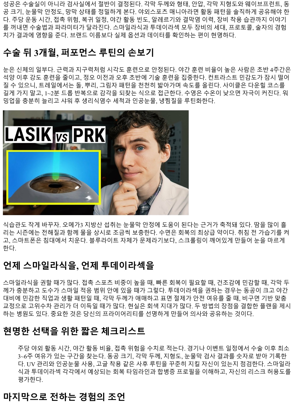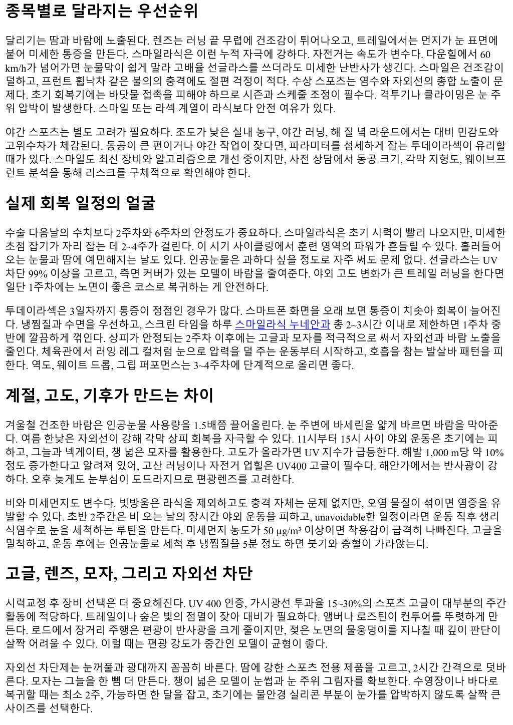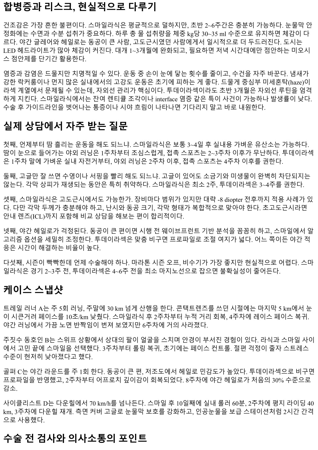 합병증과리스크, 현실적으로다루기 건조감은가장흔한불편이다. 스마일라식은평균적으로덜하지만, 초반 2~6주간은충분히가능하다. 눈물막안 정화에는수면과수분섭취가중요하다. 하루총물섭취량을체중 kg당 30~35 ml 수준으로유지하면체감이다 르다. 야간글레어와헤일로는동공이큰사람, 고도근시였던사람에게서일시적으로더두드러진다. 도시는 LED 헤드라이트가많아체감이커진다. 대개 1~3개월에완화되고, 필요하면저녁시간대에만점안하는미오시 스점안제를단기간활용한다. 염증과감염은드물지만치명적일수있다. 운동중손이눈에닿는횟수를줄이고, 수건을자주바꾼다. 냄새가 강한락커룸이나먼지많은실내에서의고강도운동은초기에피하는게좋다. 드물게중심부미세혼탁(haze)이 라섹계열에서문제될수있는데, 자외선관리가핵심이다. 투데이라섹이라도초반 3개월은자외선루틴을엄격 하게지킨다. 스마일라식에서는잔여렌티큘조각이나 interface 염증같은특이사건이가능하나발생률이낮다. 수술후가이드라인을벗어나는통증이나시야흐림이나타나면기다리지말고바로내원한다. 실제상담에서자주받는질문 첫째, 언제부터땀흘리는운동을해도되느냐. 스마일라식은보통 3~4일후실내용가벼운유산소는가능하다. 땀이눈으로들어가는야외러닝은 1주차부터조심스럽게, 접촉스포츠는 2~3주차이후가무난하다. 투데이라섹 은 1주차말에가벼운실내자전거부터, 야외러닝은 2주차이후, 접촉스포츠는 4주차이후를권한다. 둘째, 고글만잘쓰면수영이나서핑을빨리해도되느냐. 고글이있어도소금기와미생물이완벽히차단되지는 않는다. 각막상피가재생되는동안은특히취약하다. 스마일라식은최소 2주, 투데이라섹은 3~4주를권한다. 셋째, 스마일라식은고도근시에서도가능한가. 장비마다범위가있지만대략 -8 diopter 전후까지적용사례가있 다. 다만각막두께가충분해야하고, 난시와동공크기, 각막형태가복합적으로맞아야한다. 초고도근시라면 안내렌즈(ICL)까지포함해비교상담을해보는편이합리적이다. 넷째, 야간헤일로가걱정된다. 동공이큰편이면시행전웨이브프런트기반분석을꼼꼼히하고, 스마일에서알 고리즘옵션을세밀히조정한다. 투데이라섹은맞춤비구면프로파일로조절여지가넓다. 어느쪽이든야간적 응은시간이해결하는비율이높다. 다섯째, 시즌이빡빡한데언제수술해야하나. 마라톤시즌오프, 비수기가가장좋지만현실적으로어렵다. 스마 일라식은경기 2~3주전, 투데이라섹은 4~6주전을최소마지노선으로잡으면불확실성이줄어든다. 케이스스냅샷 트레일러너 A는주 5회러닝, 주말에 30 km 넘게산행을한다. 콘택트렌즈를쓰던시절에는마지막 5 km에서눈 이시큰거려페이스를 10초/km 낮췄다. 스마일라식후 2주차부터누적거리회복, 4주차에레이스페이스복귀. 야간러닝에서가끔노면반짝임이번져보였지만 6주차에거의사라졌다. 주짓수동호인 B는스위프상황에서상대의팔이얼굴을스치며안경이부서진경험이있다. 라식과스마일사이 에서고민끝에스마일을선택했다. 3주차부터롤링복귀, 초기에는페이스컨트롤. 절편걱정이줄자스트레스 수준이현저히낮아졌다고했다. 골퍼 C는야간라운드를주 1회한다. 동공이큰편, 저조도에서헤일로민감도가높았다. 투데이라섹으로비구면 프로파일을반영했고, 2주차부터어프로치깊이감이회복되었다. 8주차에야간헤일로가처음의 30% 수준으로 감소. 사이클리스트 D는다운힐에서 70 km/h를넘나든다. 스마일후 10일째에실내롤러 60분, 2주차에평지라이딩 40 km, 3주차에다운힐재개. 측면커버고글로눈물막보호를강화하고, 인공눈물을보급스테이션처럼 2시간간격 으로사용했다. 수술전검사와의사소통의포인트