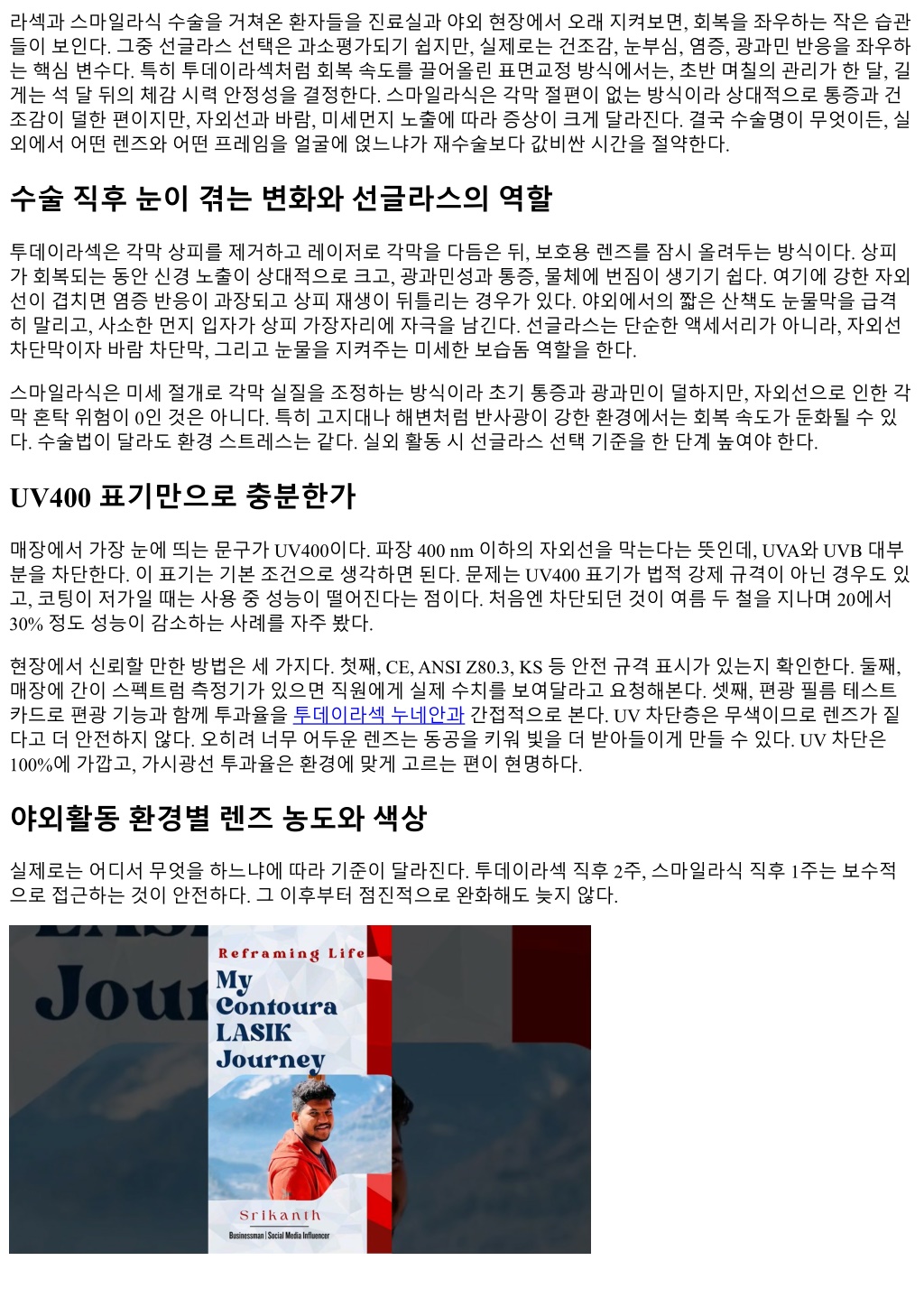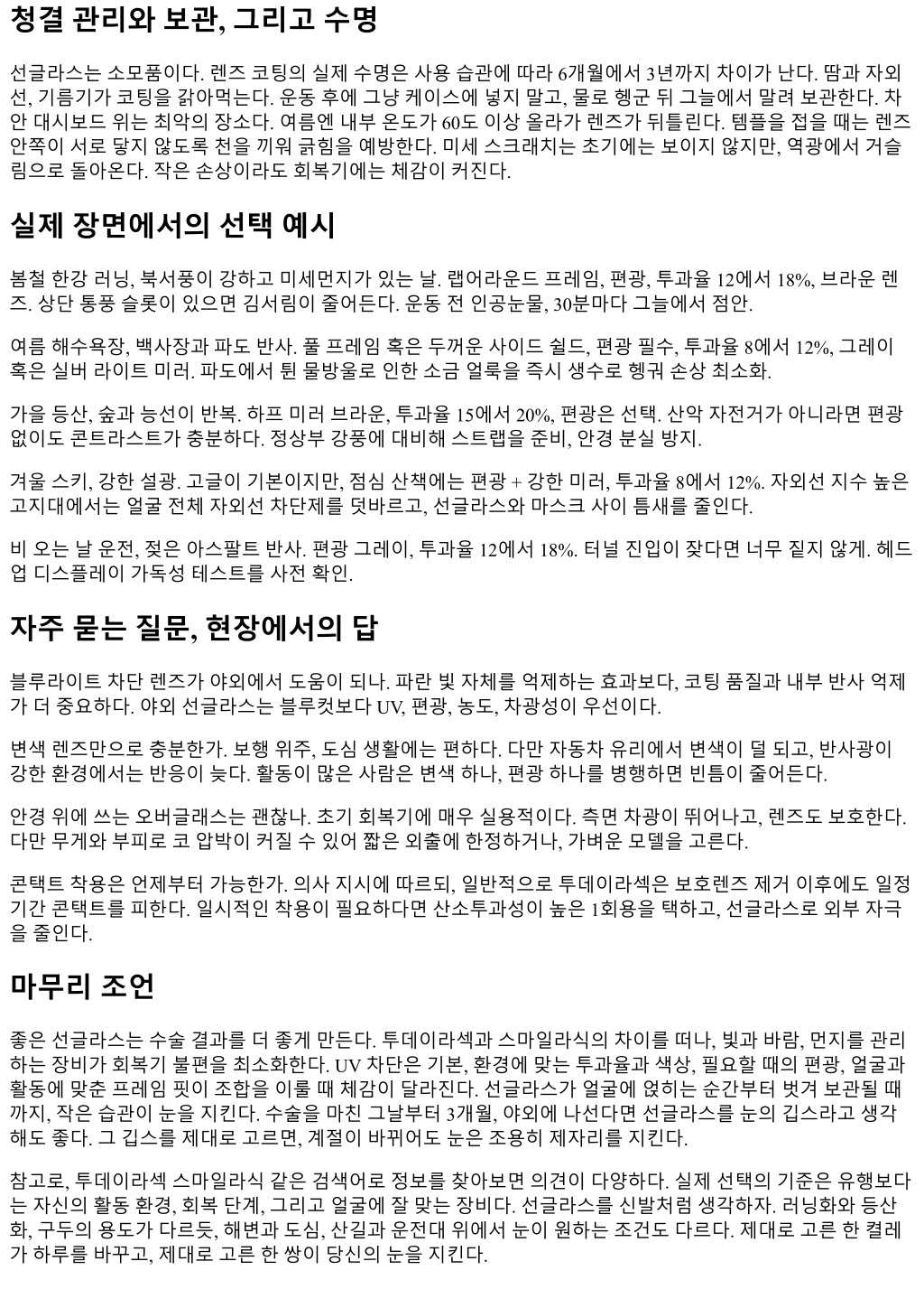 도심산책이나출퇴근길에서는가시광선투과율 15에서 25% 정도의중간농도가무난하다. 렌즈색은회색과 갈색이대표적이다. 회색은색왜곡이적어신호등, 계기판, 길바닥의요철을분별하기쉽다. 갈색은콘트라스트 를살려흐린날에도로표면의물기, 얕은홈을잘드러낸다. 투데이라섹초기에는갈색계열에서노란빛이도는 렌즈가눈부심을더부드럽게눌러주는인상을받는환자가많았다. 반사광이많거나한낮에하얀건물이많은 구역이라면 10에서 15%까지낮춰도좋지만, 실내출입이잦다면너무어두운렌즈는눈의적응을힘들게한다. 해변과수영장, 설산에서는규칙이바뀐다. 물과눈은반사율이높아서, 눈부심과산란광이일반도심보다강하 다. 이때는 8에서 12%의짙은렌즈가필요하고, 가능한편광기능을권한다. 파도와눈위반사광을눌러줘피로 도가확줄어든다. 다만자동변색렌즈는유리차량유리의 UV 차단때문에차안에서는잘변색되지않는다. 자 동차이동이많다면편광선글라스와일반안경을따로준비하는편이편하다. 등산과러닝은바람과먼지가변수다. 고도 1000 m가올라갈때마다자외선량이약 10%씩늘어난다는자료를염 두에두면, 봄햇살이라도능선위에서는여름정오와비슷하게느껴진다. 이때는프레임이얼굴을감싸는랩어 라운드형태가실용적이다. 렌즈농도는 12에서 18% 사이가다용도로쓴다. 숲길에서밝고어두운구간을번갈 아통과하므로너무짙으면발을헛디딜수있다. 가벼운러닝에서는땀과김서림관리가중요해상단환기슬롯 이있는모델을찾는편이실전적이다. 자전거와골프는지면반사와측면광원이동시다발로들어온다. 도로자전거는편광렌즈가도로표면의미세 한물기와오일을구분하기쉬워안전하다. 해질녘에는앰버계열, 구름낀날에는브라운계열이시인성을높인 다. 골프는잔디의울림광이커서녹색렌즈를피하고, 회갈색이나구리빛렌즈가컨투어를살린다. 수술후 4주 이내라면경기시간대를정오직사광선을피해조정하고, 클럽하우스와야외를오갈때는밝기변화에덜민감 하도록중간농도렌즈를선택한다. 편광렌즈는언제나정답일까 편광렌즈는수면, 도로, 유리의수평반사광을걸러피로를줄인다. 대체로운전, 해양활동, 낚시, 자전거에서는 체감효용이크다. 다만단점도있다. 항공기계기, 일부헤드업디스플레이, 은행 ATM, 스마트폰화면이기울기 에따라검게보이거나무늬가생긴다. 특히스마트폰지도를자주보는하이킹에서는화면가독성이떨어져불 편함을호소한다. 수술초기에는휴대폰화면을더가까이보는경향이있어이문제가도드라지기도한다. 화면 가독성이중요하면편광이아닌고품질반사코팅렌즈를대안으로고려할수있다. 반사코팅은상면반사를줄 여눈동자주변의산란을막아준다. 투데이라섹, 스마일라식이후기간별가이드 수술후 1주. 투데이라섹은보호렌즈를뺀직후까지포함하여광과민이가장두드러진다. 실외에서는 UV400, 편광권장, 가시광선투과율 8에서 15%의짙은렌즈를택한다. 바람이얼굴옆으로스며들지않도록랩어라운드 프레임이안정적이다. 스마일라식의경우도 1주동안은동일기준이무난하다. 밤에는운전시간을줄이고, 필요 시무색블루컷보다는투명한코팅의빛번짐억제렌즈가도움이된다. 수술후 2에서 4주. 투데이라섹은건조감과빛번짐이가라앉기시작한다. 도심생활기준으로 15에서 25% 투과 율, 회색혹은갈색렌즈로내려와도부담이없다. 장시간야외스포츠를계획한다면오전과늦은오후로활동시 간을조절하는것이자외선과피로관리에유리하다. 스마일라식은대부분이시점에일상으로복귀하지만, 장 거리운전이나고지대트레킹에는여전히적극적인차단이체감피로를줄인다. 수술후 1에서 3개월. 실외활동의제약이거의사라지지만, 여름철강한자외선환경에서는여전히선글라스를 습관처럼착용하는편이각막미세혼탁가능성을낮춘다. 이시기에는렌즈품질과착용편안함이더중요해진 다. 렌즈스크래치, 코팅벗겨짐, 프레임의미세한압박도눈물막안정성에영향을주기때문이다. 프레임의핏, 코패드, 그리고미세한압박의문제 선글라스는렌즈만보는제품이아니다. 코받침각도와템플의압력이조금만과해도눈물배출구근처에스트 레스를준다. 라섹직후에는눈물막이불안정해, 뺨이나관자놀이를누르는모델을쓰면 1시간뒤부터이물감과 눈끝따가움이반복된다. 피팅을맡길때는세가지를확인한다. 코패드가콧등에두점으로부드럽게닿는지, 템