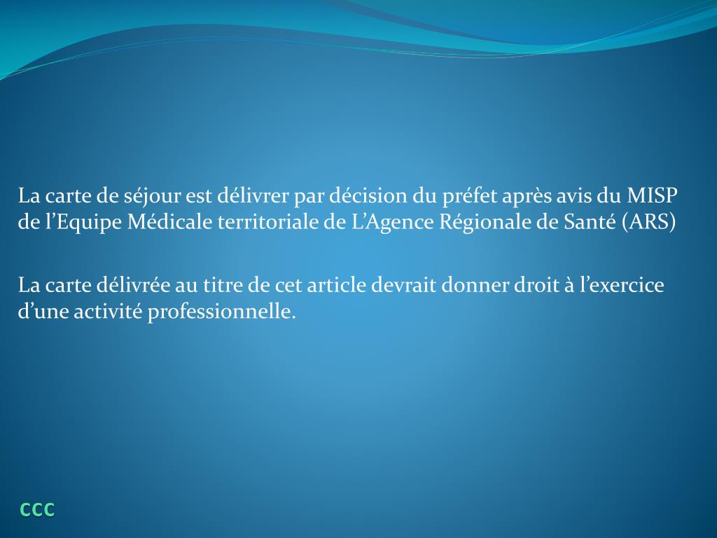 ccc La carte de séjour est délivrer par décision du préfet après avis du MISP de l’Equipe Médicale territoriale de L’Agence Régionale de Santé (ARS) La carte délivrée au titre de cet article devrait donner droit à l’exercice d’une activité professionnelle.