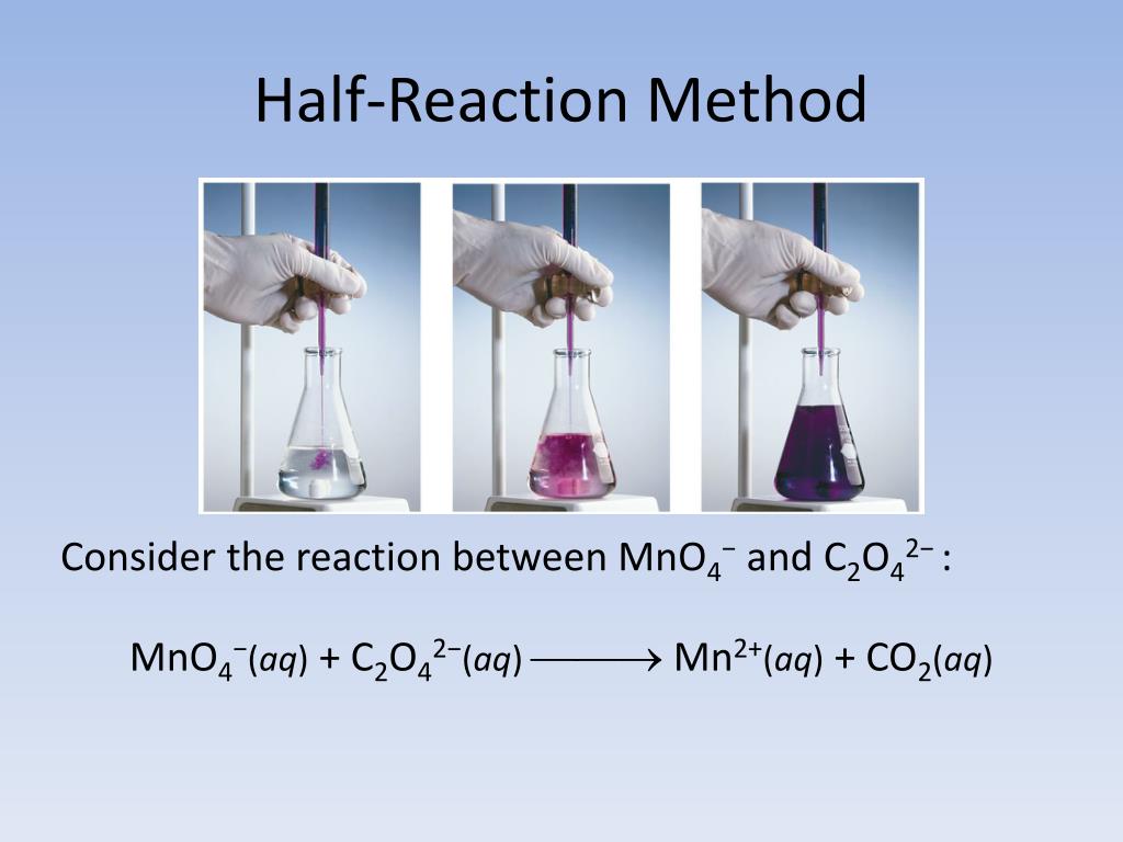 Half-Reaction Method Consider the reaction between MnO4− and C2O42− : MnO4−(aq) + C2O42−(aq) Mn2+(aq) + CO2(aq)