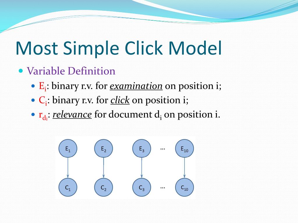 Most Simple Click Model • Variable Definition • Ei: binary r.v. for examination on position i; • Ci: binary r.v. for click on position i; • rdi: relevance for document di on position i.