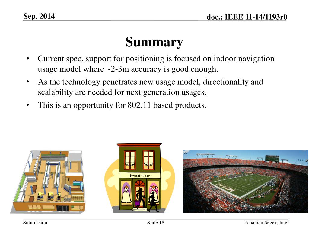 Jonathan Segev, Intel Summary • Current spec. support for positioning is focused on indoor navigation usage model where ~2-3m accuracy is good enough. • As the technology penetrates new usage model, directionality and scalability are needed for next generation usages. • This is an opportunity for 802.11 based products.