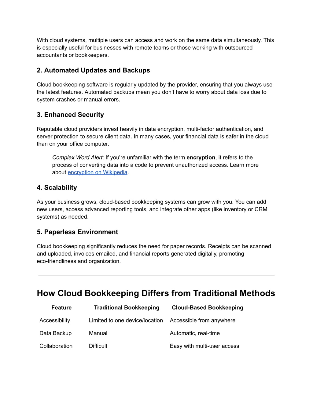 With cloud systems, multiple users can access and work on the same data simultaneously. This is especially useful for businesses with remote teams or those working with outsourced accountants or bookkeepers. 2. Automated Updates and Backups Cloud bookkeeping software is regularly updated by the provider, ensuring that you always use the latest features. Automated backups mean you don’t have to worry about data loss due to system crashes or manual errors. 3. Enhanced Security Reputable cloud providers invest heavily in data encryption, multi-factor authentication, and server protection to secure client data. In many cases, your financial data is safer in the cloud than on your office computer. Complex Word Alert: If you're unfamiliar with the term encryption, it refers to the process of converting data into a code to prevent unauthorized access. Learn more about encryption on Wikipedia. 4. Scalability As your business grows, cloud-based bookkeeping systems can grow with you. You can add new users, access advanced reporting tools, and integrate other apps (like inventory or CRM systems) as needed. 5. Paperless Environment Cloud bookkeeping significantly reduces the need for paper records. Receipts can be scanned and uploaded, invoices emailed, and financial reports generated digitally, promoting eco-friendliness and organization. How Cloud Bookkeeping Differs from Traditional Methods Feature Traditional Bookkeeping Cloud-Based Bookkeeping Accessibility Limited to one device/location Accessible from anywhere Data Backup Manual Automatic, real-time Collaboration Difficult Easy with multi-user access