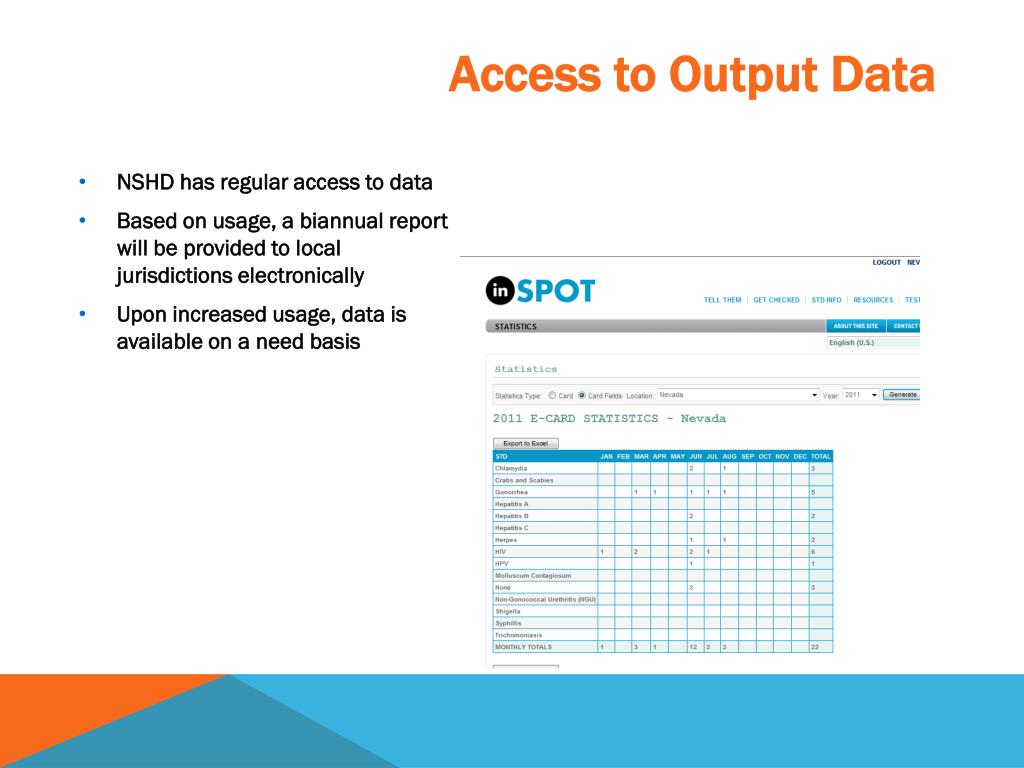 Data & Use Evaluation • How many e-cards have been sent out? • How many people present for services as a result of an inSPOT notification? • Which infections are clients notifying partners of? • Of those who receive an e-card, how many look up a test site in their area? • Are your facilities/STD clinic willing to modify intake forms and provide activity reports based on: • 1. # of clients presented as a referral to inSPOT • 2. # of clients presenting with a partner referral card or email notification • 3. How many people say they will use inSPOT for notification?