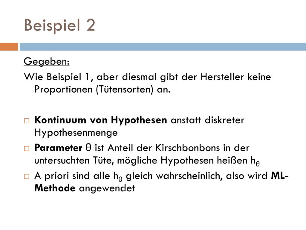 Beispiel 2 Gegeben: Wie Beispiel 1, aber diesmal gibt der Hersteller keine Proportionen (Tütensorten) an. • Kontinuum von Hypothesen anstatt diskreter Hypothesenmenge • Parameterθ ist Anteil der Kirschbonbons in der untersuchten Tüte, mögliche Hypothesen heißen hθ • A priori sind alle hθ gleich wahrscheinlich, also wird ML-Methode angewendet