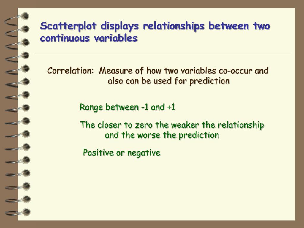 Scatterplot displays relationships between two continuous variables Correlation: Measure of how two variables co-occur and also can be used for prediction Range between -1 and +1 The closer to zero the weaker the relationship and the worse the prediction Positive or negative