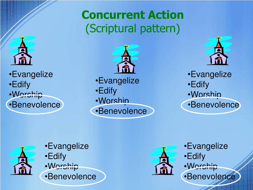 Concurrent Action(Scriptural pattern) • Evangelize • Edify • Worship • Benevolence • Evangelize • Edify • Worship • Benevolence • Evangelize • Edify • Worship • Benevolence • Evangelize • Edify • Worship • Benevolence • Evangelize • Edify • Worship • Benevolence