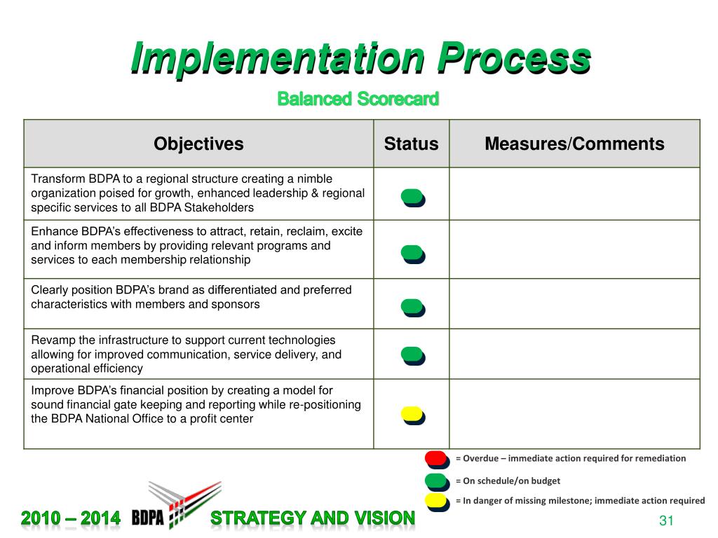 Implementation Process Balanced Scorecard = Overdue – immediate action required for remediation = On schedule/on budget = In danger of missing milestone; immediate action required