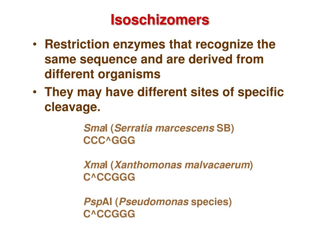 Isoschizomers • Restriction enzymes that recognize the same sequence and are derived from different organisms • They may have different sites of specific cleavage. • SmaI (Serratiamarcescens SB) • CCC^GGG • XmaI (Xanthomonasmalvacaerum) • C^CCGGG • PspAI (Pseudomonas species) • C^CCGGG