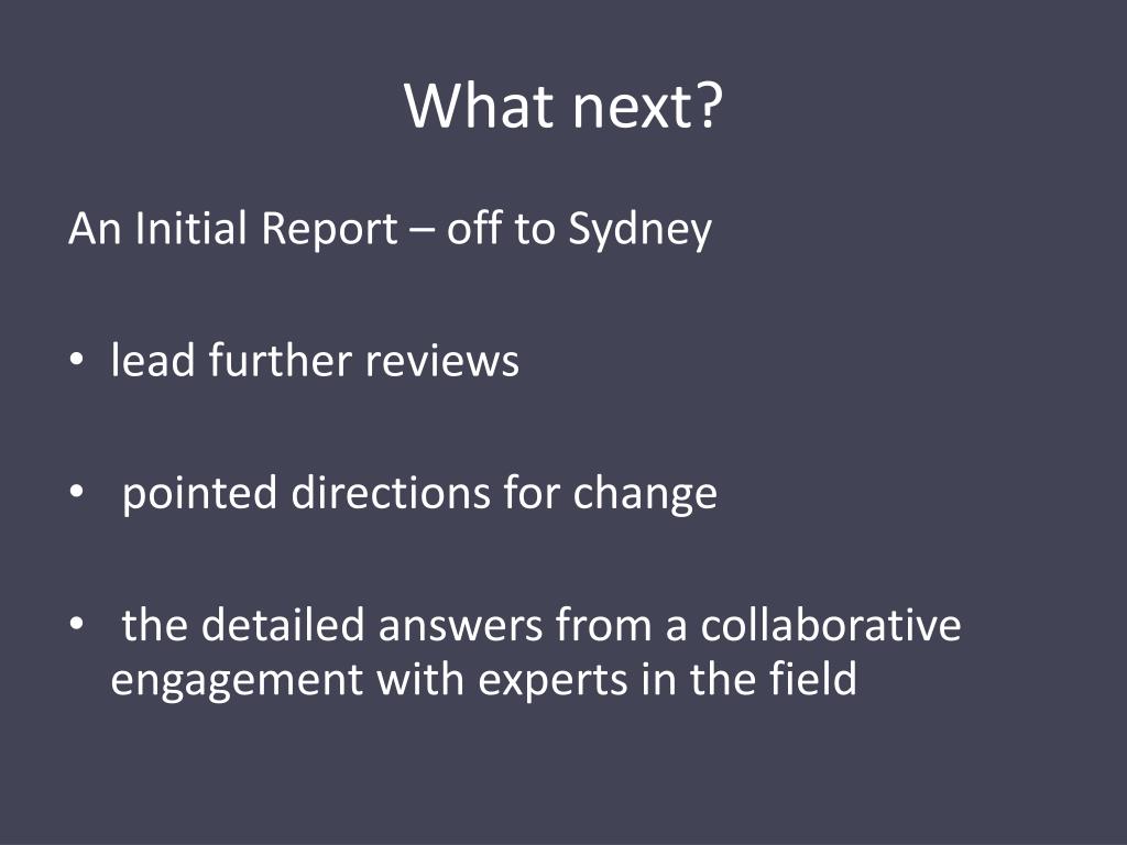 What next? An Initial Report – off to Sydney • lead further reviews • pointed directions for change • the detailed answers from a collaborative engagement with experts in the field