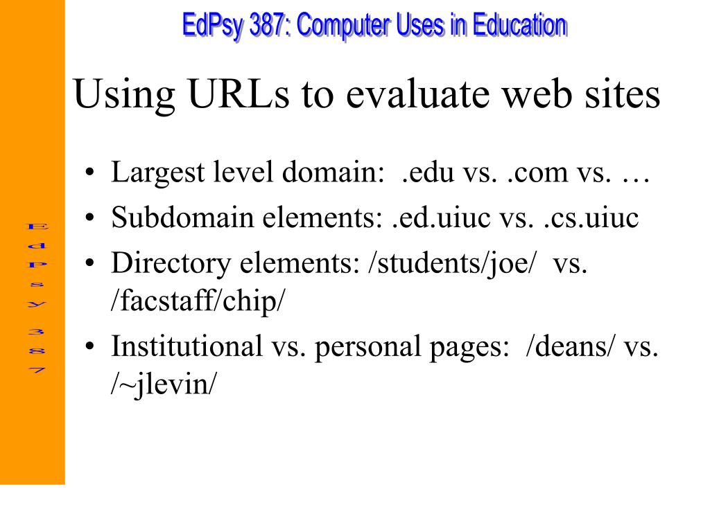 Using URLs to evaluate web sites • Largest level domain: .edu vs. .com vs. … • Subdomain elements: .ed.uiuc vs. .cs.uiuc • Directory elements: /students/joe/ vs. /facstaff/chip/ • Institutional vs. personal pages: /deans/ vs. /~jlevin/