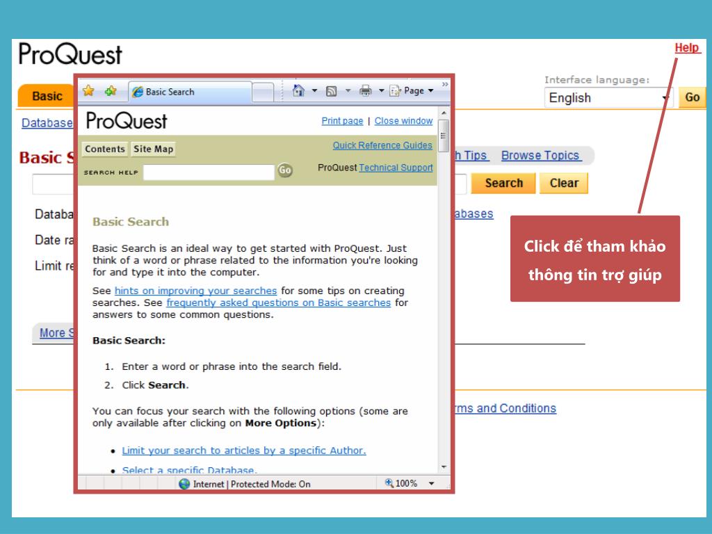 ProQuest Central Platform features & functionality 2009. Basic Search. Click để lựa chọn CSDL cần tìm kiếm. Agenda. Click để xem danh mục tài liệu hoặc thông tin cụ thể của CSDL đó. Chuyển giao diện tìm kiếm của ProQuest sang ngôn ngữ khác. Click để tham khảo thông tin trợ giúp. Agenda.