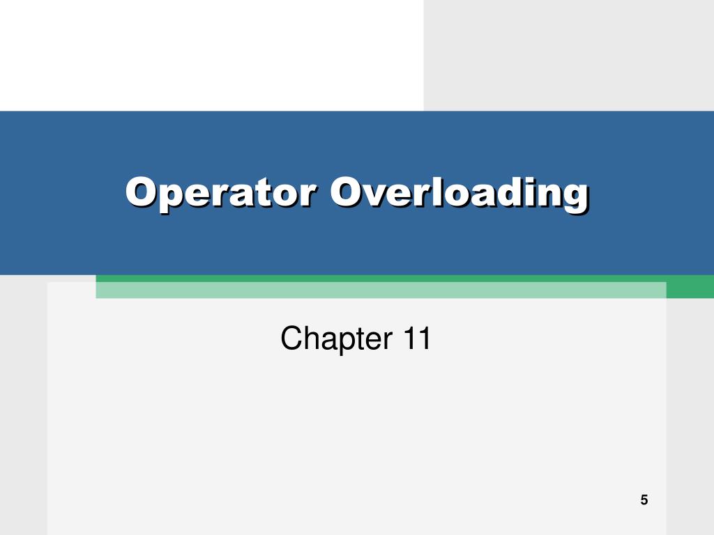 Operator Overloading (Deitel, 572–621) Sample Class in Book.h #ifndef BOOK_H #define BOOK_H #include <string> using std::string; class Book{ public: Book( string t="",int cpy=0 ): title(t), copies(cpy){} void setTitle( string t ){ title = t; } string getTitle(){ return title; } void setCopies ( int cpy ){ copies = cpy; } int getCopies(){ return copies; } string toString(){ return "Book: " + title; } private: string title; int copies; }; #endif