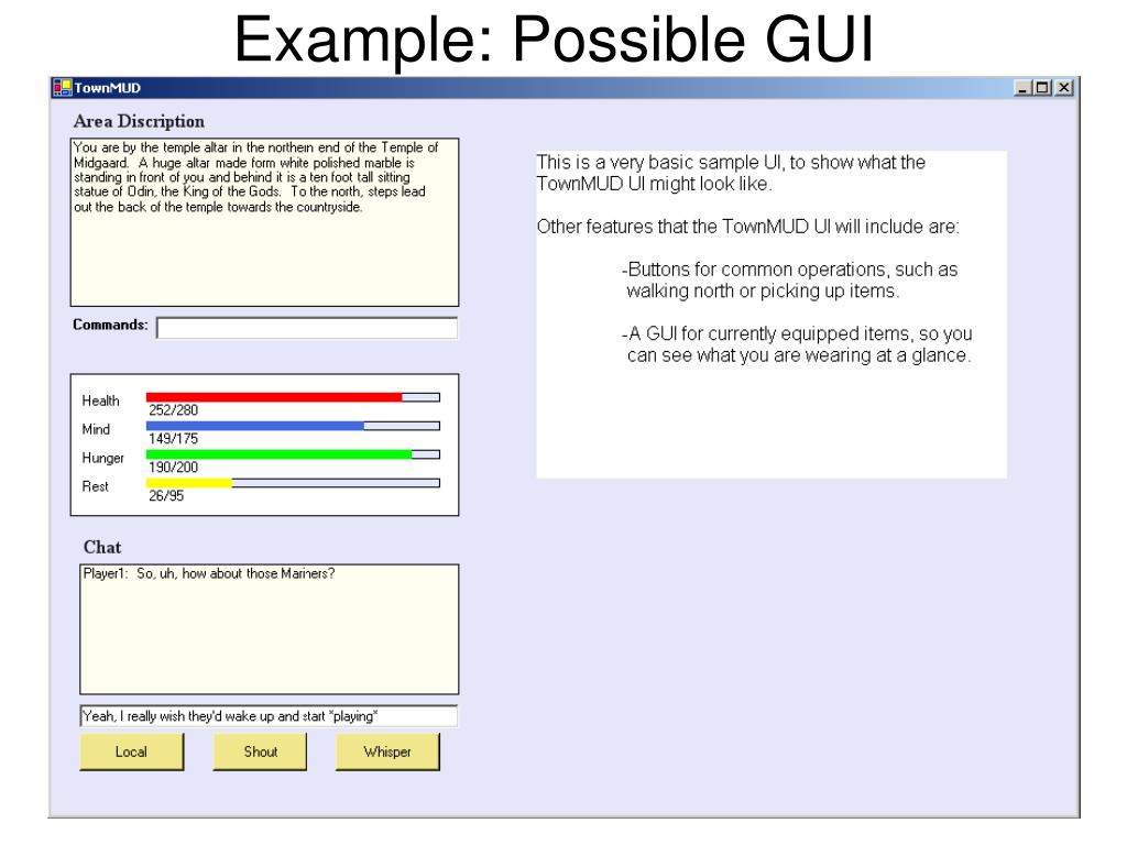 TownMUD is . . . • An easy-to-use interface for a MUD with a client-server architecture • Downloaded off of the Internet • Useable by anyone with a Windows machine and an Internet browser who knows how to download files off of the Internet and run them • A fairly simple world whose main advantage is its GUI, not the richness of its environment. Significant changes will be made to the game TownMUD is based on, however development time is too short to focus on many game details. • Fun!!! (of course)