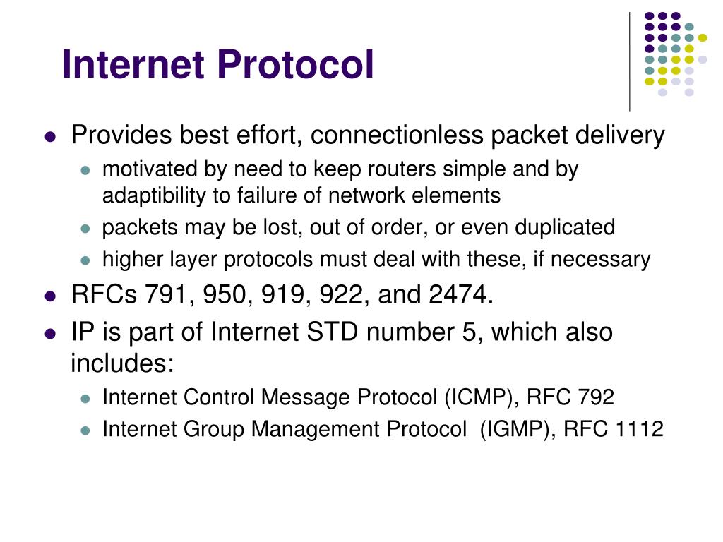 Internet Protocol • Provides best effort, connectionless packet delivery • motivated by need to keep routers simple and by adaptibility to failure of network elements • packets may be lost, out of order, or even duplicated • higher layer protocols must deal with these, if necessary • RFCs 791, 950, 919, 922, and 2474. • IP is part of Internet STD number 5, which also includes: • Internet Control Message Protocol (ICMP), RFC 792 • Internet Group Management Protocol (IGMP), RFC 1112