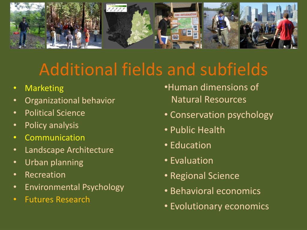 Additional fields and subfields • Marketing • Organizational behavior • Political Science • Policy analysis • Communication • Landscape Architecture • Urban planning • Recreation • Environmental Psychology • Futures Research • Human dimensions of Natural Resources • Conservation psychology • Public Health • Education • Evaluation • Regional Science • Behavioral economics • Evolutionary economics