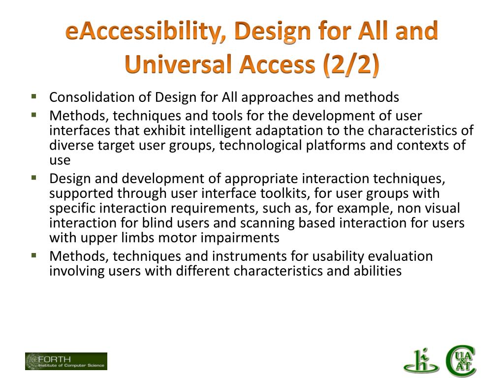 eAccessibility, Design for All and Universal Access (2/2) • Consolidation of Design for All approaches and methods • Methods, techniques and tools for the development of user interfaces that exhibit intelligent adaptation to the characteristics of diverse target user groups, technological platforms and contexts of use • Design and development of appropriate interaction techniques, supported through user interface toolkits, for user groups with specific interaction requirements, such as, for example, non visual interaction for blind users and scanning based interaction for users with upper limbs motor impairments • Methods, techniques and instruments for usability evaluation involving users with different characteristics and abilities