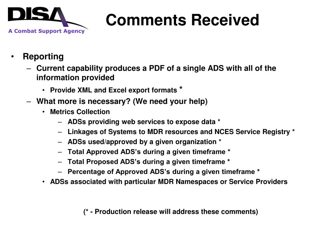 Comments Received • Reporting • Current capability produces a PDF of a single ADS with all of the information provided • Provide XML and Excel export formats * • What more is necessary? (We need your help) • Metrics Collection • ADSs providing web services to expose data * • Linkages of Systems to MDR resources and NCES Service Registry * • ADSs used/approved by a given organization * • Total Approved ADS’s during a given timeframe * • Total Proposed ADS’s during a given timeframe * • Percentage of Approved ADS’s during a given timeframe * • ADSs associated with particular MDR Namespaces or Service Providers (* - Production release will address these comments)