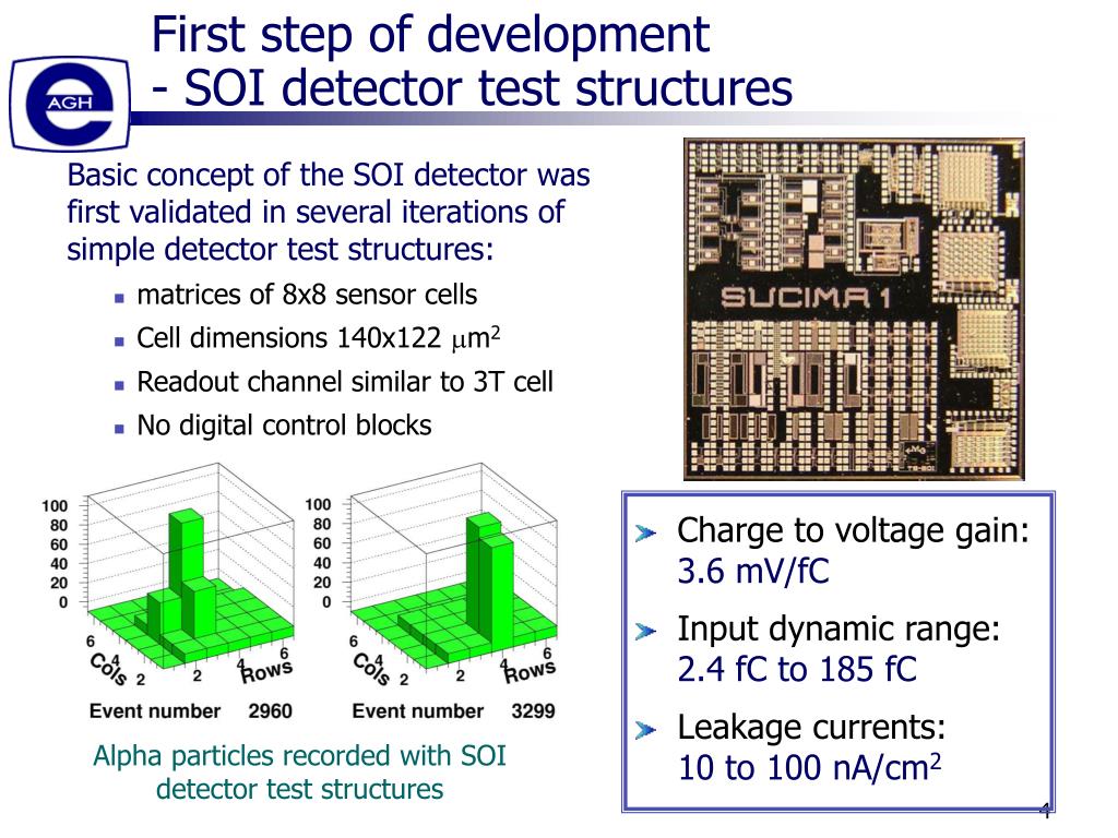 First step of development - SOI detector test structures Basic concept of the SOI detector was first validated in several iterations of simple detector test structures: • matrices of 8x8 sensor cells • Cell dimensions 140x122 m2 • Readout channel similar to 3T cell • No digital control blocks Charge to voltage gain: 3.6 mV/fC Input dynamic range: 2.4 fC to 185 fC Leakage currents: 10 to 100 nA/cm2 Alpha particles recorded with SOI detector test structures